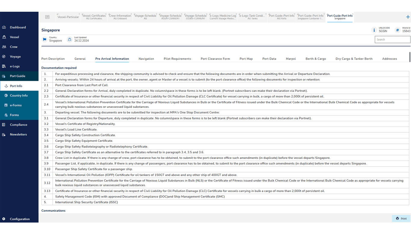 Pre-filled ready-to-print arr-dep port papers made in a matter of minutes for the voyage. Regulations: Inbuilt requirement explorer and library with current and relevant information on rules and regulations.