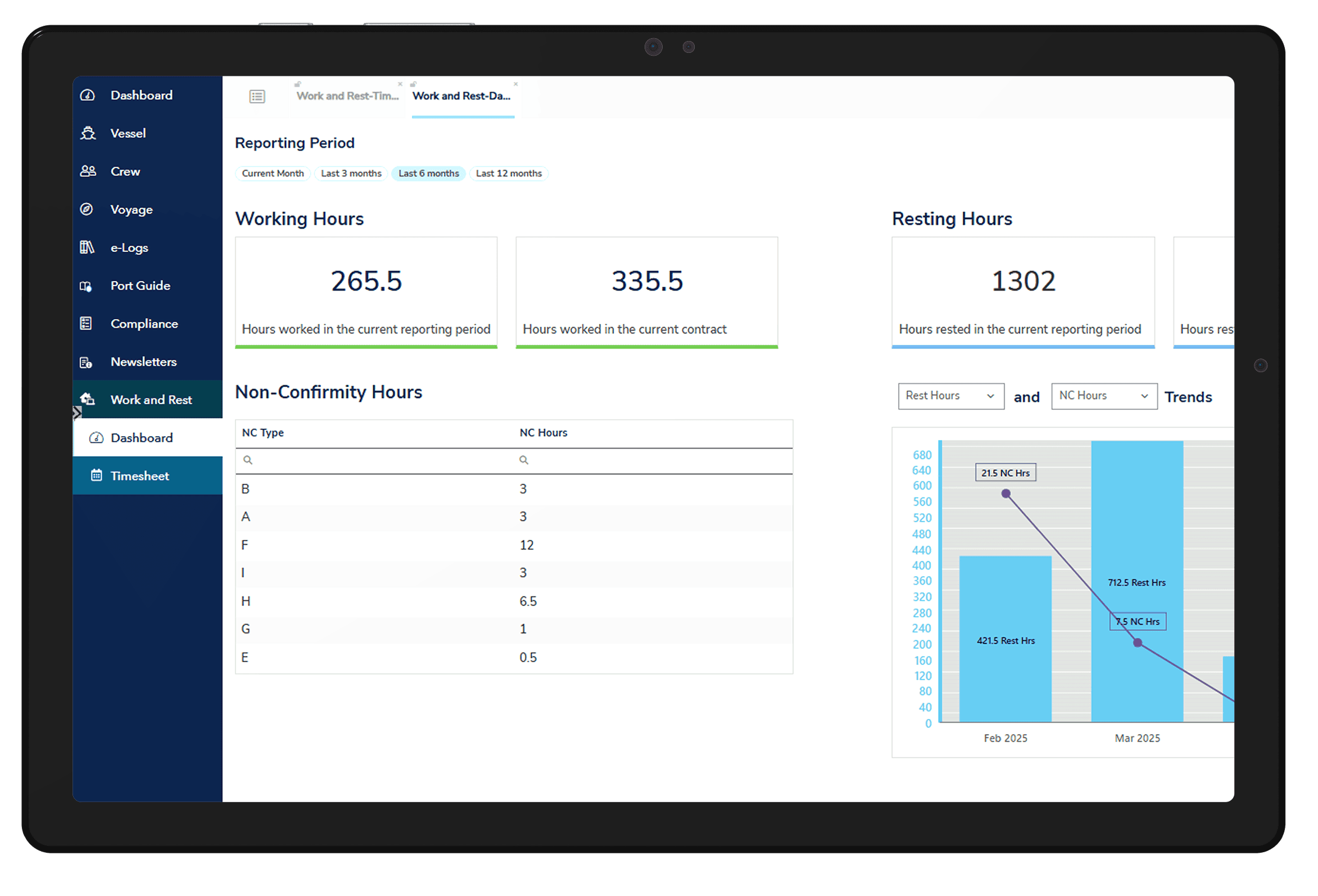 Integrates with crewing systems to monitor, document, and alert when approaching work/rest violations, creating auditable records that satisfy Port State Control inspections.