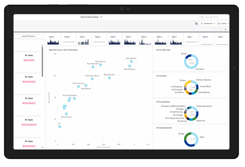 An advanced analytic integration allows data-driven decisions based on insights from non-compliance data. Additionally, the Master can create rest hour reports in the official IMO/ILO format for signing.​