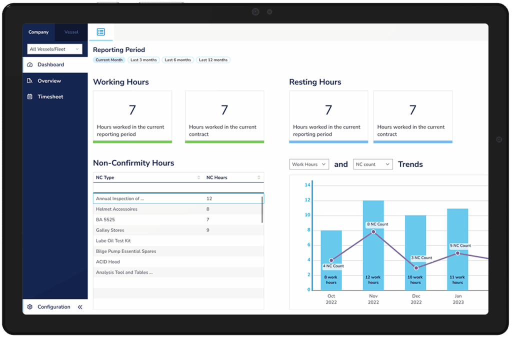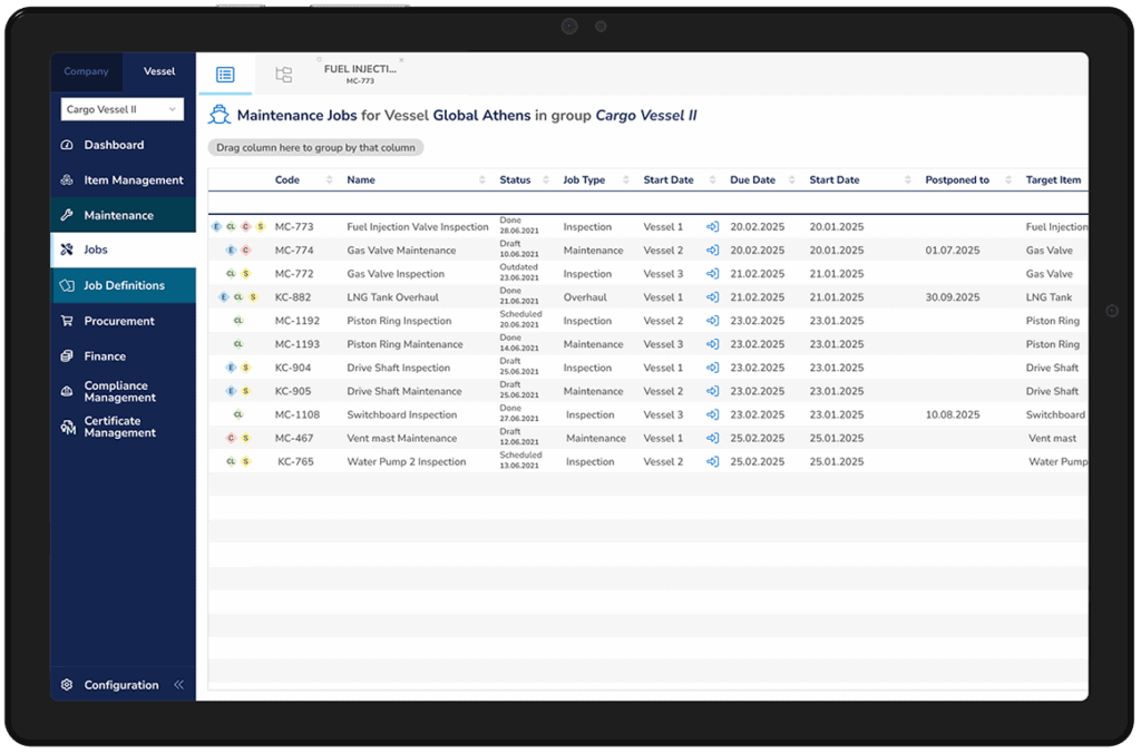 The dashboard gives you a structured overview of all vessels and core activities. From this central view, you can jump directly into maintenance, procurement, QHSE or crewing – ship by ship or fleet-wide.